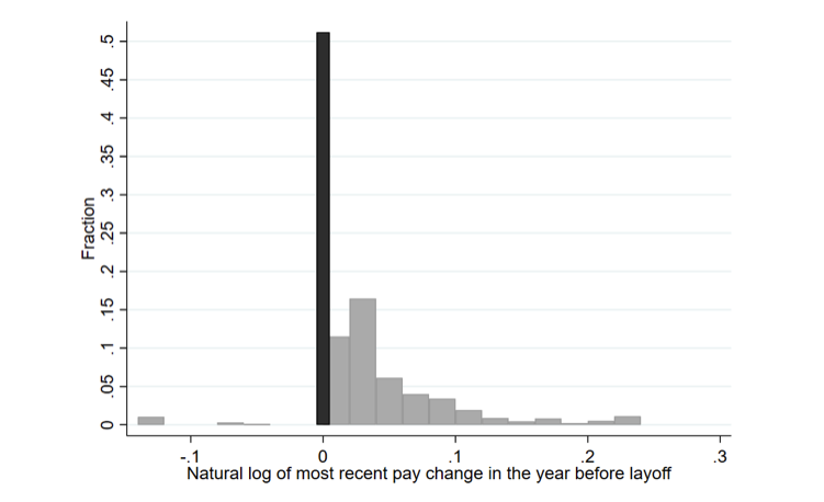Moreover, actual pay cuts before job loss are also rare among UI benefit recipients. Figure 1 makes this point by displaying a histogram for the distribution of changes in log hourly wages in the twelve months before job loss. Fewer than 1.5 percent of job losers had a wage cut in the twelve months before their layoff. More than half experienced no wage change in the twelve months before layoff, and 46 percent received a nominal wage increase.